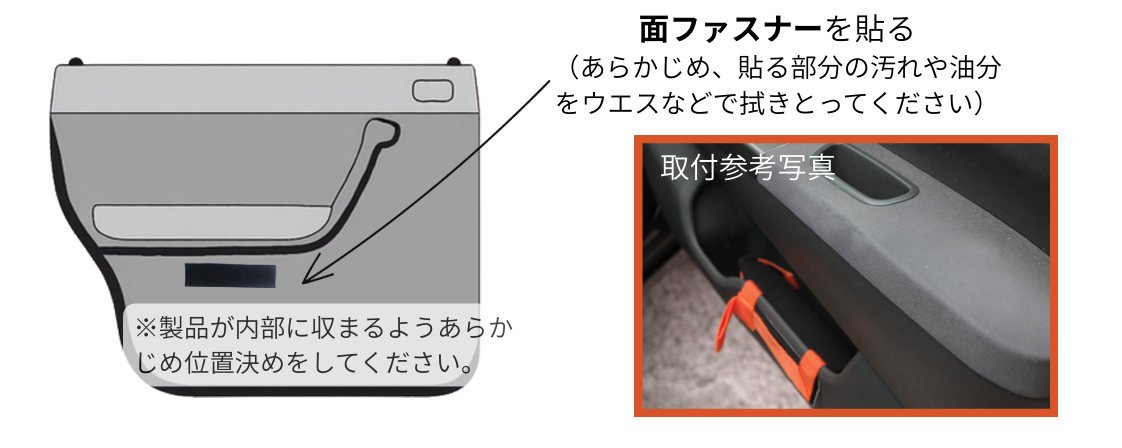 - 面ファスナー(取付方法参照)を貼りつけることで、車のドアポケット等に装着